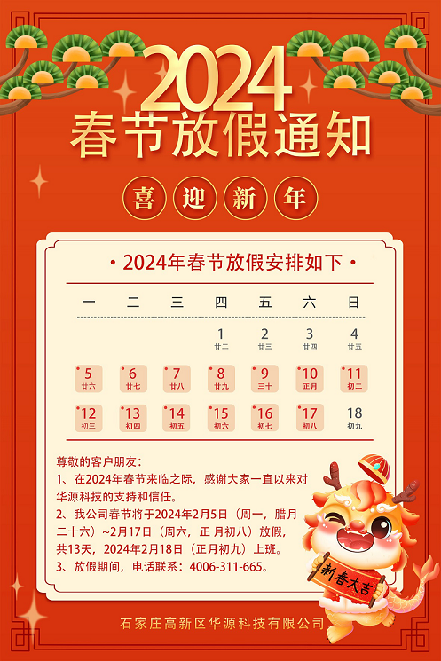 石家莊高新區華源科技春節放假通知,公司是石家莊專業的太陽能、空氣能熱泵服務商,擁有豐富的行業經驗、專業的技術服務,熱水洗浴、制冷、采暖系統咨詢定制電話:4006-311-665,華源科技祝大家新年快樂,龍年吉祥!
